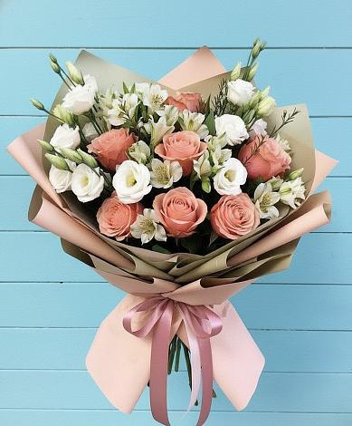 Букет из роз, альстромерий и лизиантусов, в современном исполнении. Персиково- розовые розы смотрятся особенно пышно и шикарно в обрамлении воздушных лизиантусов и сочных альстромерий. Этот букет будет выглядеть достойным подарком по любому поводу.