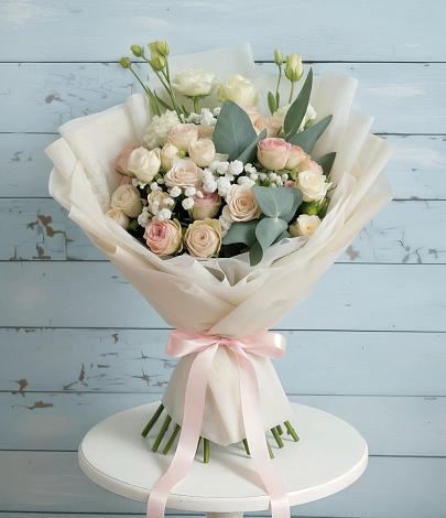 Этот букет словно создан для того, чтобы подарить моменты нежности и вдохновения. Деликатные розы с мягкими оттенками кремового и розового переплетаются с пушистой гипсофилой и свежей зеленью эвкалипта, создавая гармоничную и изысканную композицию. Стильная упаковка кремового цвета и элегантная розовая лента добавляют букету легкости и утончённости. Такой букет — идеальный выбор для поздравления с особым событием, выражения чувств или просто приятного сюрприза для дорогого человека.